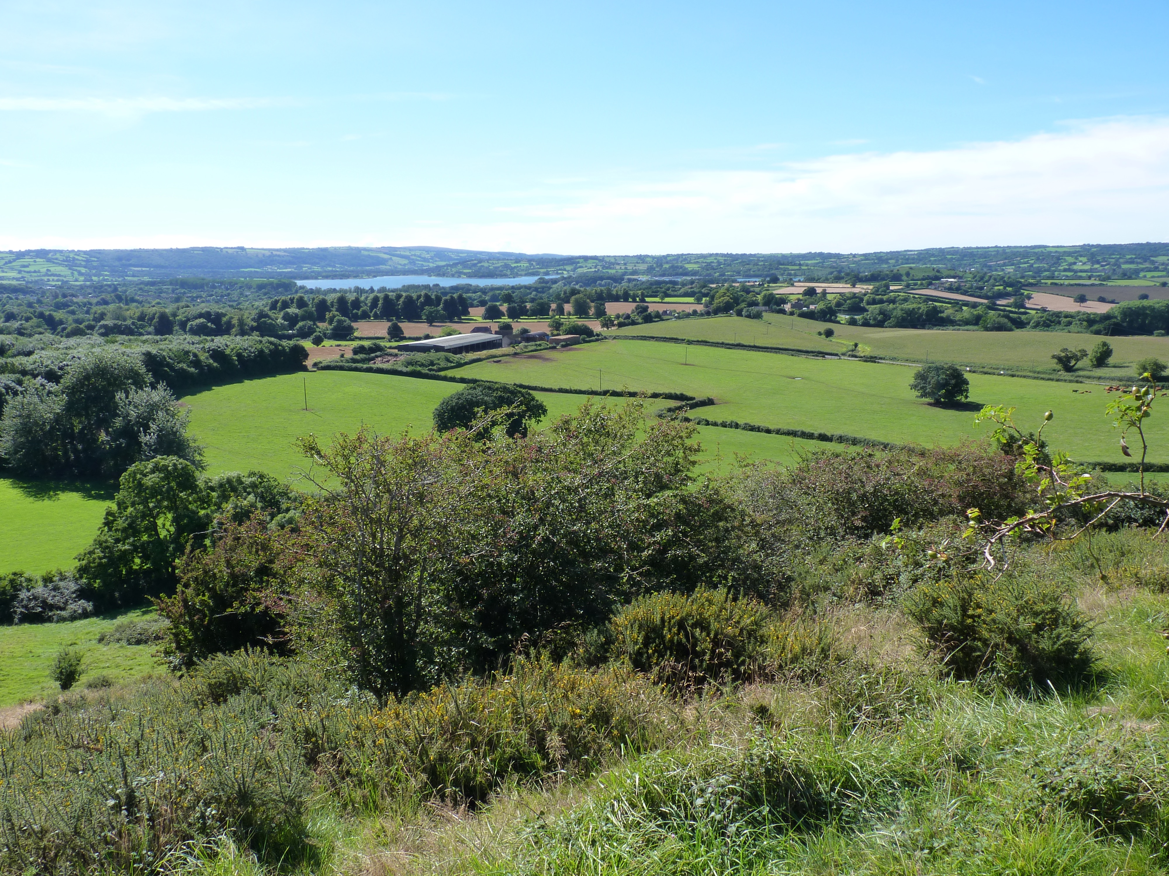 Looking from the top of a hill, across a foreground of shrubs and bramble, with farmed fields in the middle and a lake in the distance.